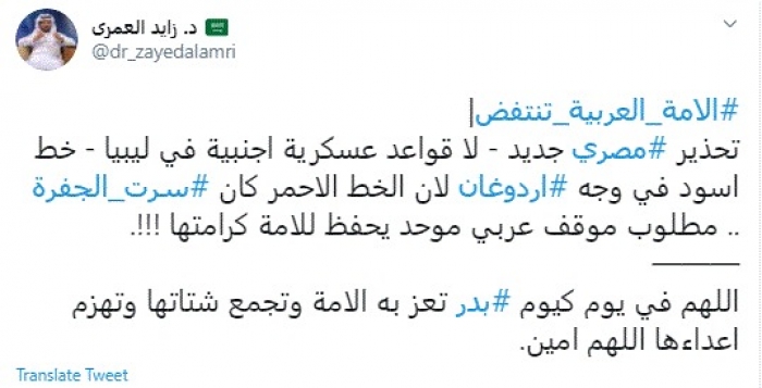 وقال في تغريدة عبر "تويتر" رصدها "المشهد العربي": "الأمة العربية تنتفض| تحذير مصري جديد لا قواعد عسكرية أجنبية في ليبيا - خط أسود في وجه أردوغان لأن الخط الأحمر كان سرت الجفرة .. مطلوب موقف عربي موحد يحفظ للأمة كرامتها".