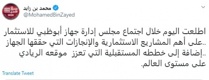 وقال في تغريدة عبر "تويتر" رصدها "المشهد العربي": اطلعت اليوم خلال اجتماع مجلس إدارة جهاز أبوظبي للاستثمار ..على أهم المشاريع الاستثمارية والإنجازات التي حققها الجهاز ..إضافة إلى خططه المستقبلية التي تعزز موقعه الريادي على مستوى العالم".