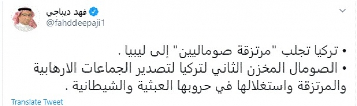 وقال في تغريدة عبر "تويتر" رصدها "المشهد العربي": "تركيا تجلب مرتزقة صوماليين إلى ليبيا . الصومال المخزن الثاني لتركيا لتصدير الجماعات الارهابية والمرتزقة واستغلالها في حروبها العبثية والشيطانية".
