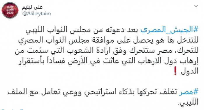وكتب في تغريدة عبر "تويتر" رصدها "المشهد العربي": "الجيش المصري بعد دعوته من مجلس النواب الليبي للتدخل ها هو يحصل على موافقة مجلس النواب المصري للتحرك، مصر ستتحرك وفق إرادة الشعوب التي سئمت من إرهاب دول الارهاب التي عاثت في الأرض فساداً باستقرار الدول".