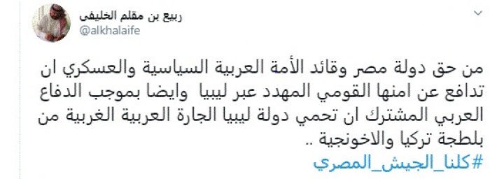تفاعل الناشط السياسي ربيع بن مقلم الخليفي، اليوم، مع هاشتاج "كلنا الجيش المصري".