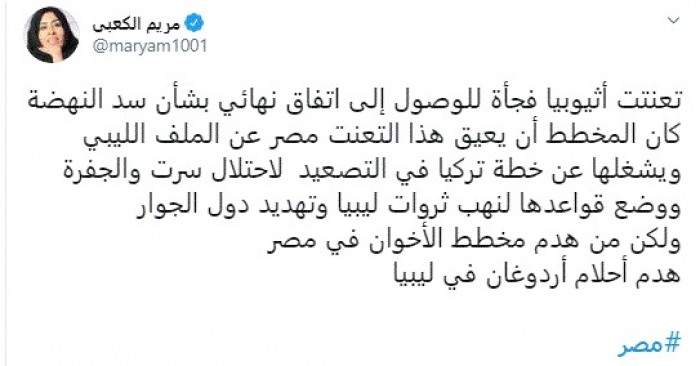 وقالت في تغريدة عبر "تويتر" رصدها "المشهد العربي": "تعنتت أثيوبيا فجأة للوصول إلى اتفاق نهائي بشأن سد النهضة كان المخطط أن يعيق هذا التعنت مصر عن الملف الليبي ويشغلها عن خطة تركيا في التصعيد لاحتلال سرت والجفرة ووضع قواعدها لنهب ثروات ليبيا وتهديد دول الجوار".