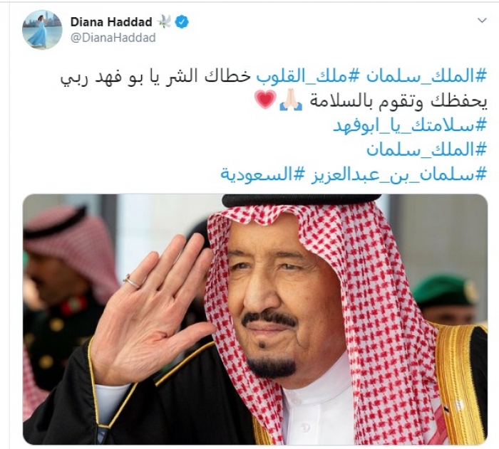 ونشرت ديانا، صورة الملك سلمان، عبر حسابها الرسمي بموقع تويتر، وعلقت: "الملك ملك القلوب، خطاك الشر يا أبو فهد، ربي يحفظك وتقوم بالسلامة".