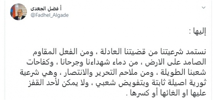 وكتب في تغريدة عبر "تويتر" رصدها "المشهد العربي": "نستمد شرعيتنا من قضيتنا العادلة، ومن الفعل المقاوم الصامد على الأرض، من دماء شهداءنا وجرحانا وكفاحات شعبنا الطويلة، ومن ملاحم التحرير والانتصار".