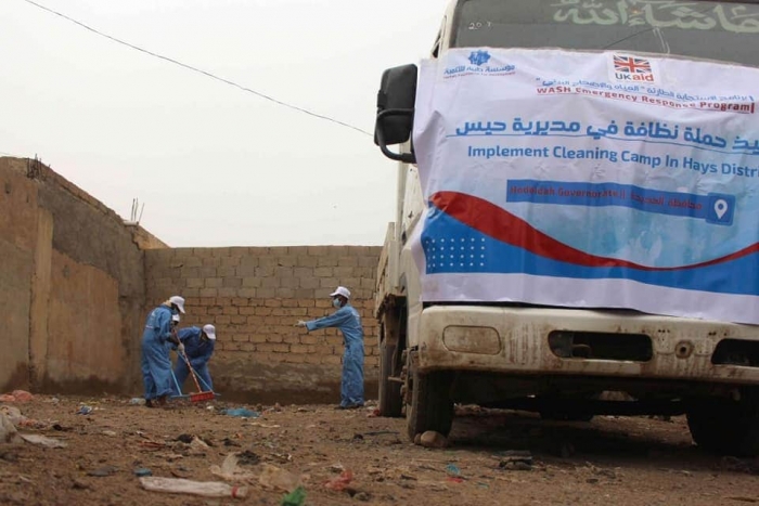 دشنت منظمة الأمم المتحدة للطفولة، يونيسف، اليوم الثلاثاء، حملة نظافة - ضمن برنامج الاستجابة الطارئة - في تجمعات النازحين بمديرية حيس.