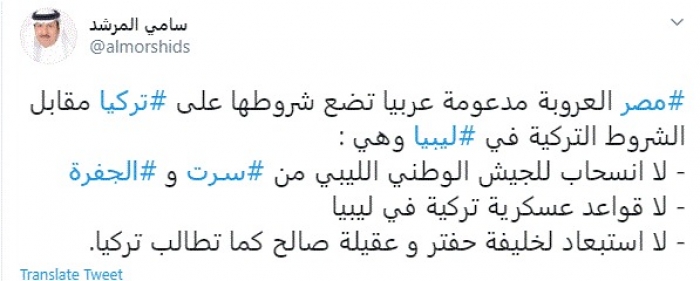 وقال في تغريدة عبر "تويتر" رصدها "المشهد العربي": "مصر العروبة مدعومة عربيا تضع شروطها على تركيا مقابل الشروط التركية في ليبيا وهي: لا انسحاب للجيش الوطني الليبي من سرت والجفرة لا قواعد عسكرية تركية في ليبيا لا استبعاد لخليفة حفتر وعقيلة صالح كما تطالب تركيا".