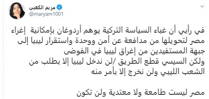 وجهت الإعلامية والكاتبة الإماراتية مريم الكعبي، اليوم، رسالة نارية إلى الرئيس التركي رجب طيب أردوغان بشأن الدور المصري في ليبيا.