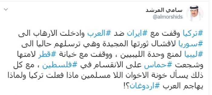 وكتب عبر تغريدة له على "تويتر" رصدها " المشهد العربي": "تركيا وقفت مع إيران ضد العرب وأدخلت الإرهاب إلى سوريا لإفشال ثورتها المجيدة وهي ترسلهم حاليا إلى ليبيا لمنع وحدة الليبيين، ووقفت مع خيانة قطر لأمتها وشجعت حماس على الانقسام في فلسطين ، مع كل ذلك يسأل خونة الإخوان اللامسلمين ماذا فعلت تركيا ولماذا يهاجم العرب أردوغان".