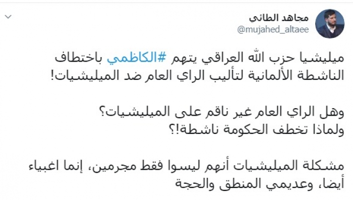وكتب عبر تغريدة له على "تويتر" رصدها " المشهد العربي": "مليشيا حزب الله العراقي تتهم الكاظمي باختطاف الناشطة الألمانية لتأليب الرأي العام ضد الميليشيات، وهل الرأي العام غير ناقم على المليشيات؟ ولماذا تخطف الحكومة ناشطة، مشكلة المليشيات أنهم ليسوا فقط مجرمين، إنما أغبياء أيضا، وعديمي المنطق والحجة".