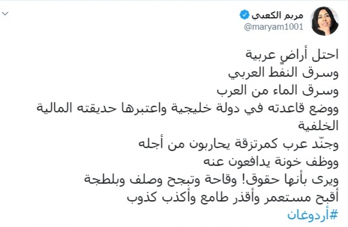 هاجمت الإعلامية والكاتبة الإماراتية مريم الكعبي، اليوم الثلاثاء، رئيس النظام التركي رجب طيب أردوغان.