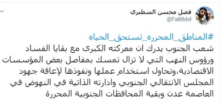 وكتب عبر تغريدة له على "تويتر" رصدها "المشهد العربي": "شعب الجنوب يدرك أن معركته الكبرى مع بقايا الفساد ورؤوس النهب التي لا تزال تمسك بمفاصل بعض المؤسسات الاقتصادية، وتحاول استخدام عملها ونفوذها لإعاقة جهود المجلس الانتقالي الجنوبي وإدارته الذاتية في النهوض في العاصمة عدن وبقية المحافظات الجنوبية المحررة"