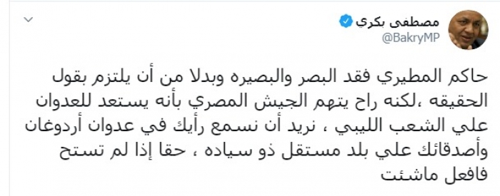 وكتب عبر تغريدة له على "تويتر" رصدها " المشهد العربي": "حاكم المطيري فقد البصر والبصيرة وبدلا من أن يلتزم بقول الحقيقة، لكنه راح يتهم الجيش المصري بأنه يستعد للعدوان على الشعب الليبي، نريد أن نسمع رأيك في عدوان أردوغان وأصدقائك على بلد مستقل ذو سيادة ، حقا إذا لم تستح فأفعل ماشئت".