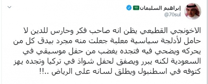 وكتب عبر تغريدة له على "تويتر" رصدها " المشهد العربي":"الإخونجي القطيعي يظن أنه صاحب فكر وحارس للدين لا حامل لأدلجة سياسية معلبة جعلت منه مجرد بيدق كل من يحركه ويضحي فيه فتجده يغضب من حفل موسيقي في السعودية لكنه يبرر ويصفق لحفل شواذ في تركيا وتجده يهز كتوفه في إسطنبول ويطلق لسانه على الرياض ".