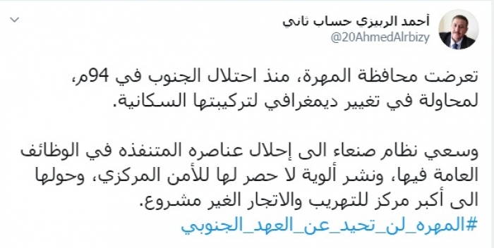 وكتب عبر تغريدة له على "تويتر" رصدها "المشهد العربي": "تعرضت محافظة المهرة، منذ احتلال الجنوب في 94م، لمحاولة تغيير ديمغرافي لتركيبتها السكانية، وسعي نظام صنعاء الى إحلال عناصره المتنفذة في الوظائف العامة فيها، ونشر ألوية لا حصر لها للأمن المركزي، وحولها إلى أكبر مركز للتهريب والاتجار غير المشروع".