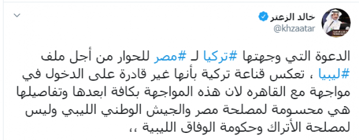 وكتب عبر تغريدة له على "تويتر" رصدها " المشهد العربي": "الدعوة التي وجهتها تركيا لمصر للحوار من أجل ملف ليبيا، تعكس قناعة تركية بأنها غير قادرة على الدخول في مواجهة مع القاهرة، لأن هذه المواجهة بكافة أبعادها وتفاصيلها هي محسومة لمصلحة مصر والجيش الوطني الليبي وليس لمصلحة الأتراك وحكومة الوفاق الليبية".
