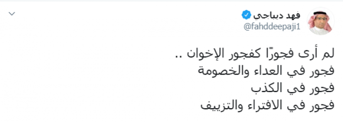 وكتب عبر تغريدة له على "تويتر" رصدها " المشهد العربي": "لم أرى فجورًا كفجور الإخوان، فجور في العداء والخصومة، فجور في الكذب، فجور في الافتراء والتزييف".