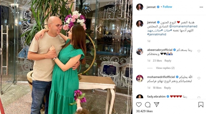 وجهت المطربة المغربية جنات رسالة رومانسية لزوجها، ونشرت صورة تجمعهما، عبر حسابها الرسمي بموقع "إنستجرام".
