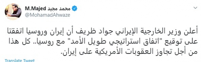 وقال في تغريدة عبر "تويتر" رصدها "المشهد العربي": "أعلن وزير الخارجية الإيراني جواد ظريف أن إيران وروسيا اتفقتا على توقيع اتفاق استراتيجي طويل الأمد مع روسيا.. كل هذا من أجل تجاوز العقوبات الأمريكية على إيران".
