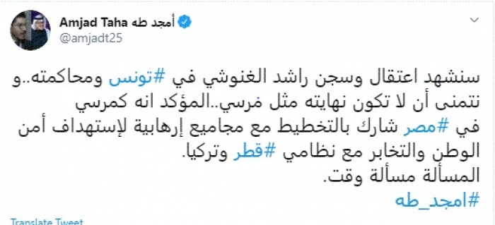وقال في تغريدة عبر "تويتر" رصدها "المشهد العربي": "سنشهد اعتقال وسجن راشد الغنوشي في تونس ومحاكمته.. ونتمنى أن لا تكون نهايته مثل مرسي..المؤكد أنه كمرسي".