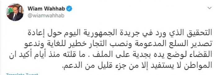 وقال في تغريدة عبر "تويتر" رصدها "المشهد العربي": "التحقيق الذي ورد في جريدة الجمهورية اليوم حول إعادة تصدير السلع المدعومة ونصب التجار خطير للغاية وندعو القضاء لوضع يده بجدية على الملف".