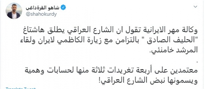 وقال في تغريدة عبر "تويتر" رصدها "المشهد العربي": "وكالة مهر الإيرانية تقول أن الشارع العراقي يطلق هاشتاغ الحليف الصادق بالتزامن مع زيارة الكاظمي لإيران ولقاء المرشد خامنئي".