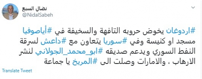 وقال في تغريدة عبر "تويتر" رصدها "المشهد العربي": "أردوغان يخوض حروبه التافهة والسخيفة في أيا صوفيا مسجد أو كنيسة وفي سوريا يتعاون مع داعش لسرقة النفط السوري".