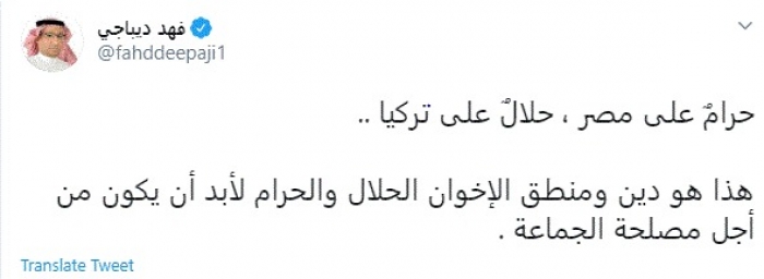 وقال في تغريدة عبر "تويتر" رصدها "المشهد العربي": "حرامٌ على مصر، حلالٌ على تركيا".