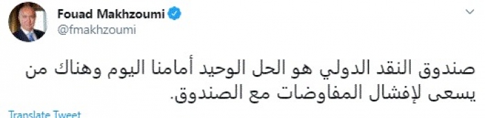 وكتب في تغريدة عبر "تويتر" رصدها "المشهد العربي": "صندوق النقد الدولي هو الحل الوحيد أمامنا اليوم وهناك من يسعى لإفشال المفاوضات مع الصندوق".