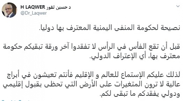 وقال في تغريدة عبر "تويتر" رصدها "المشهد العربي": "نصيحة لحكومة المنفى اليمنية المعترف بها دوليًا. قبل أن تقع الفأس في الرأس لا تفقدوا آخر ورقة تبقيكم حكومة معترف بها، أي الاعتراف الدولي".