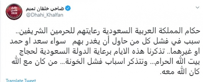وقال في تغريدة عبر "تويتر" رصدها "المشهد العربي": "حكام المملكة العربية السعودية رعايتهم للحرمين الشريفين.. سبب في فشل كل من حاول أن يغدر بهم سواء سعد أو حمد أو غيرهما".