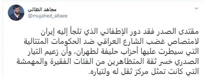 وكتب في تغريدة عبر "تويتر" رصدها "المشهد العربي": "مقتدى الصدر فقد دور الإطفائي الذي تلجأ إليه إيران لامتصاص غضب الشارع العراقي ضد الحكومات المتتالية التي سيطرت عليها أحزاب حليفة لطهران".