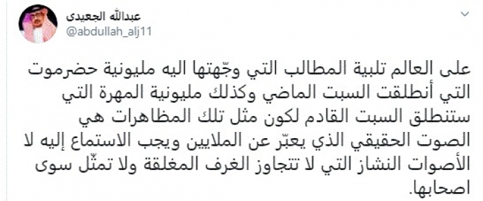 وأضاف: "لكون مثل تلك المظاهرات هي الصوت الحقيقي الذي يعبّر عن الملايين ويجب الاستماع إليه".