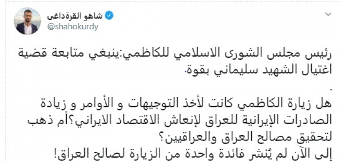 طالب الكاتب الصحفي العراقي شاهو القرةداغي، اليوم، رئيس الوزراء العراقي مصطفى الكاظمي بكشف أسباب زيارته لإيران.