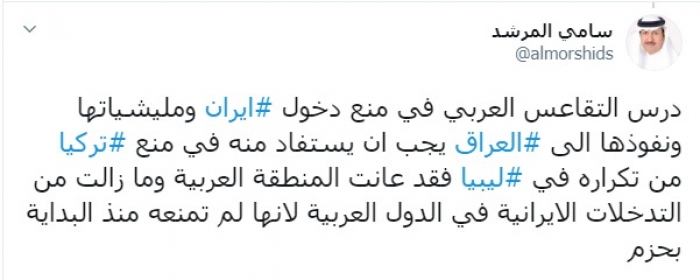 وكتب عبر تغريدة له على "تويتر" رصدها " المشهد العربي": "درس التقاعس العربي في منع دخول إيران ومليشياتها ونفوذها إلى العراق يجب أن يستفاد منه في منع تركيا من تكراره في ليبيا، فقد عانت المنطقة العربية وما زالت من التدخلات الإيرانية في الدول العربية لأنها لم تمنعه منذ البداية بحزم".