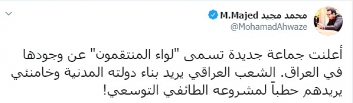 وكتب عبر تغريدة له على "تويتر" رصدها " المشهد العربي": "أعلنت جماعة جديدة تسمى "لواء المنتقمون" عن وجودها في العراق، الشعب العراقي يريد بناء دولته المدنية وخامنئي يريدهم حطباً لمشروعه الطائفي التوسعي".