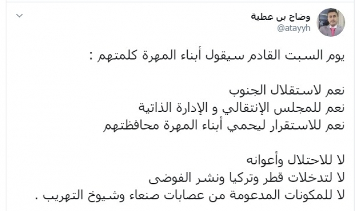 وكتب عبر تغريدة له على "تويتر" رصدها "المشهد العربي": "يوم السبت القادم سيقول أبناء المهرة كلمتهم، نعم لاستقلال الجنوب، نعم للمجلس الانتقالي والإدارة الذاتية، نعم للاستقرار ليحمي أبناء المهرة محافظتهم".