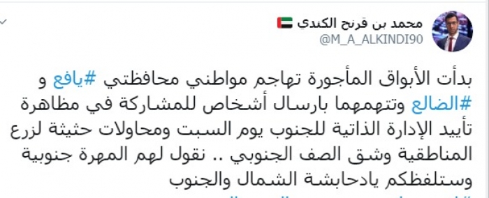وكتب عبر تغريدة له على "تويتر" رصدها "المشهد العربي": "بدأت الأبواق المأجورة تهاجم مواطني محافظتي يافع والضالع وتتهمهم بإرسال أشخاص للمشاركة في مظاهرة تأييد الإدارة الذاتية للجنوب يوم السبت ومحاولات حثيثة لزرع المناطقية وشق الصف الجنوبي، نقول لهم المهرة جنوبية وستلفظكم يا دحابشة الشمال والجنوب".
