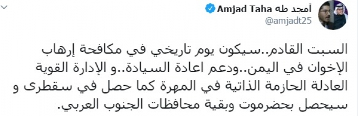 وكتب عبر تغريدة له على "تويتر" رصدها "المشهد العربي": "السبت القادم، سيكون يوما تاريخيا في مكافحة إرهاب الإخوان في اليمن، ودعم إعادة السيادة، والإدارة القوية العادلة الحازمة الذاتية في المهرة كما حصل في سقطرى وسيحصل بحضرموت وبقية محافظات الجنوب العربي".