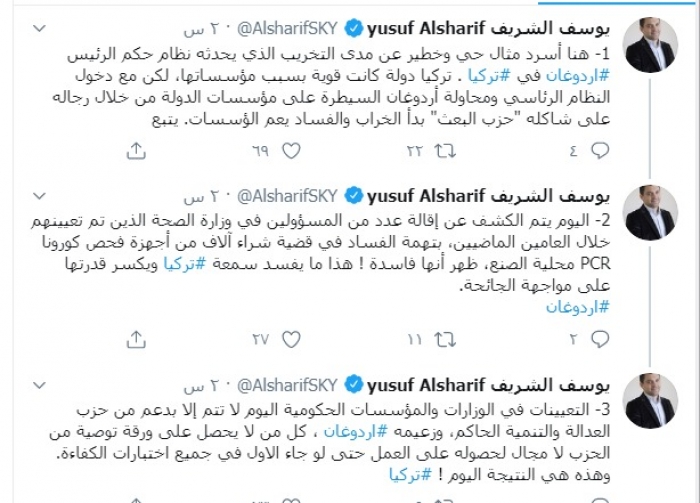 وكتب عبر تغريدات له على "تويتر" رصدها " المشهد العربي": "هنا أسرد مثال حي وخطير عن مدى التخريب الذي يحدثه نظام حكم الرئيس أردوغان في تركيا، تركيا دولة كانت قوية بسبب مؤسساتها، لكن مع دخول النظام الرئاسي ومحاولة أردوغان السيطرة على مؤسسات الدولة من خلال رجاله على شاكله "حزب البعث" بدأ الخراب والفساد يعم المؤسسات".
