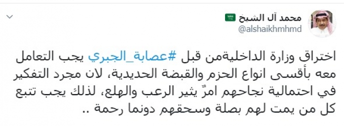 وكتب عبر تغريدة له على "تويتر" رصدها " المشهد العربي": "اختراق وزارة الداخلية من قبل عصابة الجبري يجب التعامل معه بأقسى أنواع الحزم والقبضة الحديدية، لأن مجرد التفكير في احتمالية نجاحهم أمرٌ يثير الرعب والهلع، لذلك يجب تتبع كل من يمت لهم بصلة وسحقهم دونما رحمة".