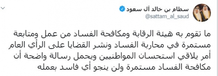 قال الأمير السعودي البارز سطام بن خالد آل سعود، الأربعاء، إن مكافحة الفساد مستمرة في المملكة، ولن ينجو فاسد بعمله.