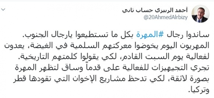 وكتب عبر تغريدة له على "تويتر" رصدها "المشهد العربي": "ساندوا رجال المهرة بكل ما تستطيعون يا رجال الجنوب، المهريون اليوم يخوضون معركتهم السلمية في الغيضة، يعدون لفعالية يوم السبت القادم، لكي يقولوا كلمتهم التاريخية".