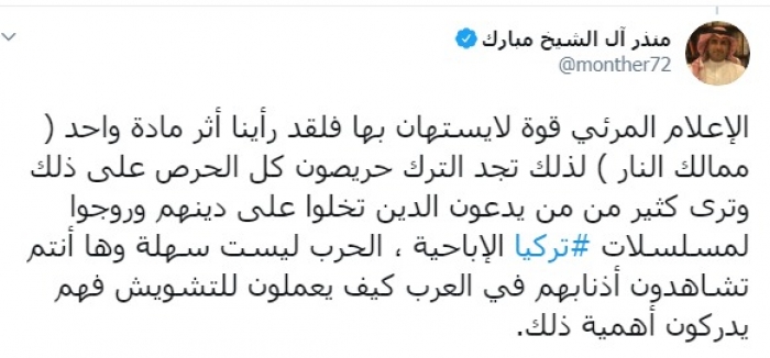 وكتب عبر تغريدة له على "تويتر" رصدها " المشهد العربي": "الإعلام المرئي قوة لا يستهان بها فلقد رأينا أثر مادة واحد( ممالك النار ) لذلك تجد الترك حريصون كل الحرص على ذلك وترى كثير من يدعون الدين تخلوا على دينهم وروجوا لمسلسلات تركيا الإباحية ، الحرب ليست سهلة وها أنتم تشاهدون أذنابهم في العرب كيف يعملون للتشويش فهم يدركون أهمية ذلك".