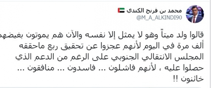 وكتب عبر تغريدة له على "تويتر" رصدها " المشهد العربي": "قالوا ولد ميتًا وهو لا يمثل إلا نفسه والآن هم يموتون بغيظهم ألف مرة في اليوم لأنهم عجزوا عن تحقيق ربع ما حققه المجلس الانتقالي الجنوبي على الرغم من الدعم الذي حصلوا عليه ، لأنهم فاشلون، فاسدون، منافقون ،خائنون".