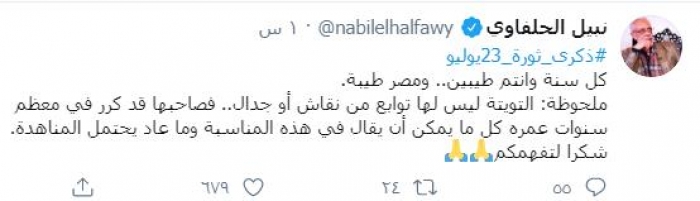 وكتب "الحلفاوي" عبر حسابه الرسمي بموقع تويتر: "ذكرى ثورة 23 يوليو، كل سنة وانتم طيبين ومصر طيبة، ملحوظة: التويتة ليس لها توابع من نقاش أو جدال، فصاحبها قد كرر في معظم سنوات عمره كل ما يمكن أن يقال في هذه المناسبة وما عاد يحتمل المناهدة، شكرا لتفهمكم".