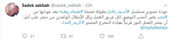 وكتب الصباح، عبر حسابه الرسمي بموقع تويتر: "عودة تصوير مسلسل أسود فاتح، بطولة نجمتنا هيفاء وهبي بعد عودتها من مصر بخير".
