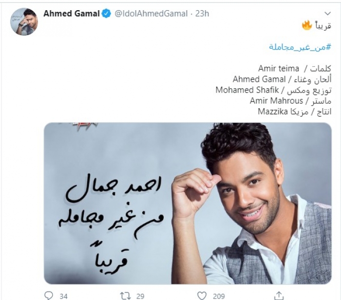 وكتب جمال: "قريبا، من غير مجاملة، كلمات أمير طعيمة، ألحان أحمد جمال، توزيع محمد شفيق، إنتاج مزيكا".