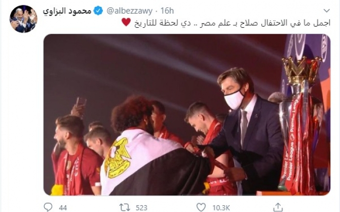 ونشر البزاوي، صورة صلاح وهو يتسلم الميدالية ويضع علم مصر على ظهره، عبر حسابه الرسمي على تويتر، وعلق: "أجمل ما في الإحتفال، صلاح بعلم مصر .. دي لحظة للتاريخ".
