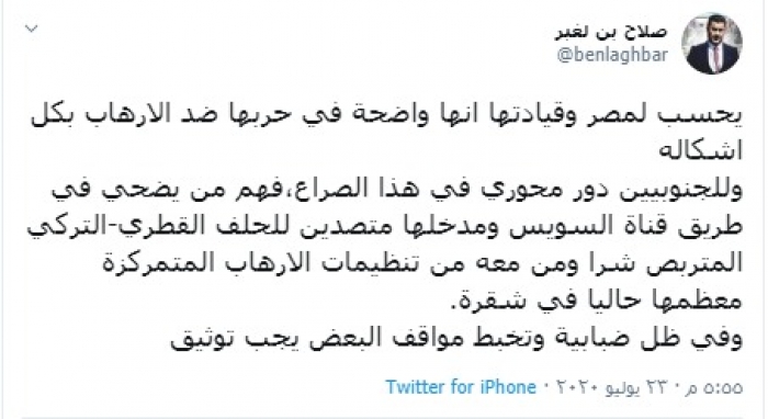 وكتب "بن لغبر" في تغريدة بتويتر، رصدها "المشهد العربي": "يحسب لمصر وقيادتها أنها واضحة في حربها ضد الإرهاب بكل أشكاله وللجنوبيين دور محوري في هذا الصراع، فهم من يضحي في طريق قناة السويس ومدخلها متصدين للحلف القطري - التركي المتربص شرا ومن معه من تنظيمات الإرهاب المتمركزة معظمها حاليا في شقرة، وفي ظل ضبابية وتخبط مواقف البعض يجب توثيق".
