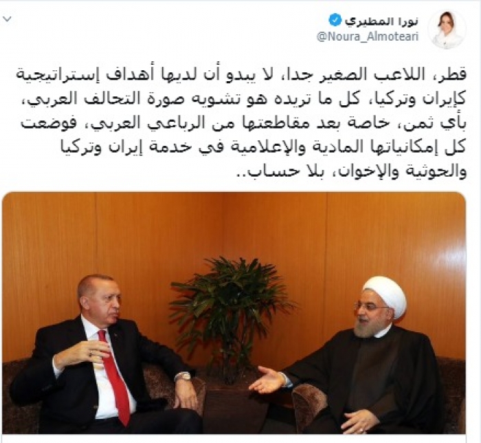 وكتبت "المطيري" في تغريدة بتويتر، رصدها "المشهد العربي": "قطر، اللاعب الصغير جدا، لا يبدو أن لديها أهدافا استراتيجية كإيران وتركيا، كل ما تريده هو تشويه صورة التحالف العربي، بأي ثمن، خاصة بعد مقاطعتها من الرباعي العربي، فوضعت كل إمكانياتها المادية والإعلامية في خدمة إيران وتركيا والحوثية والإخوان، بلا حساب.